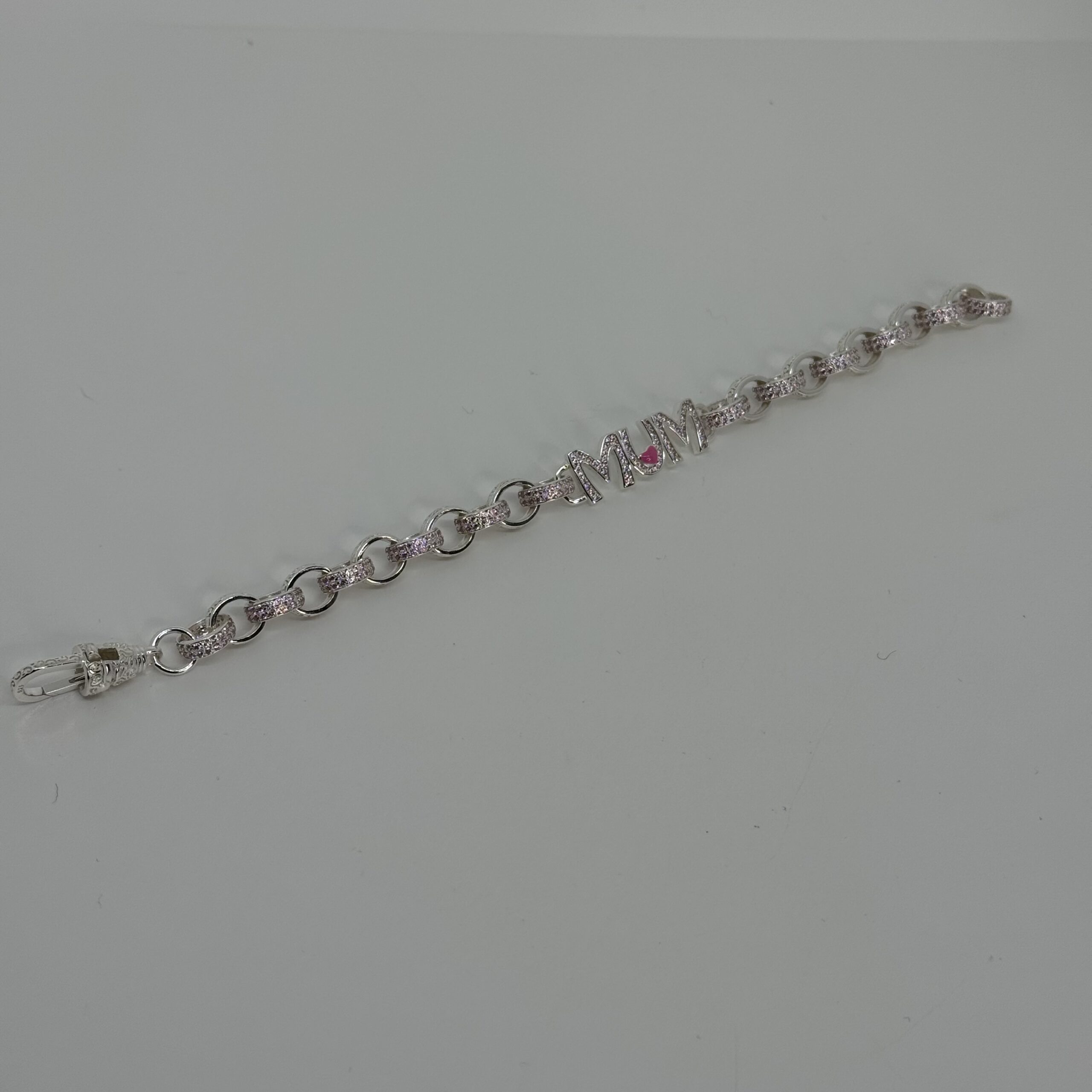Sterling Silver Ladies Baby Pink Mum Belcher Bracelet with baby pink cubic zirconias